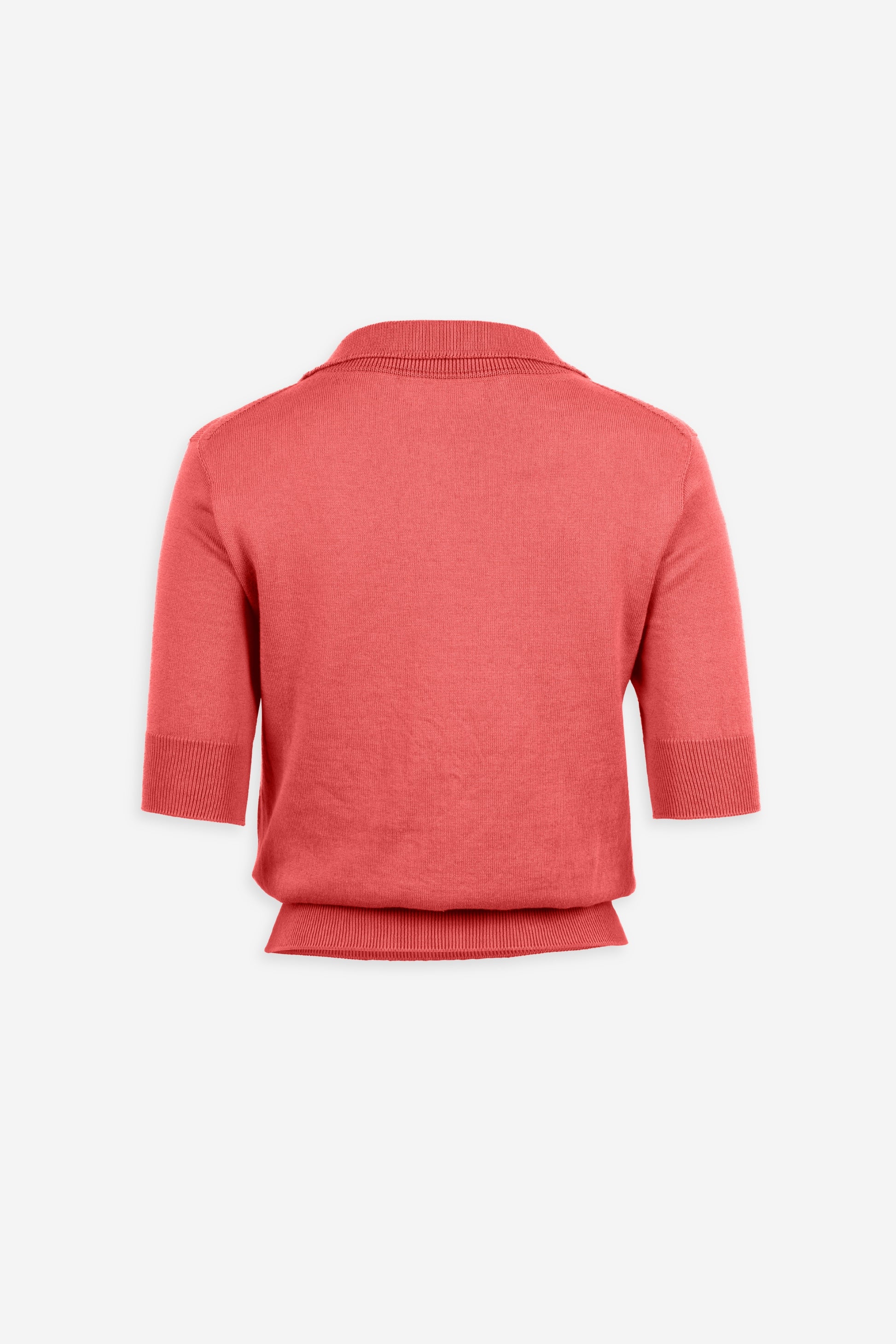 A lightweight women’s knit polo shirt with soft structure and a subtle vintage-inspired silhouette, knit from breathable Egyptian cotton, featuring elbow-length sleeves, a three-button placket, subtle ribbed texture at the waist, and a gently fitted hem. A refined take on the short sleeve knit polo for effortless, polished style.