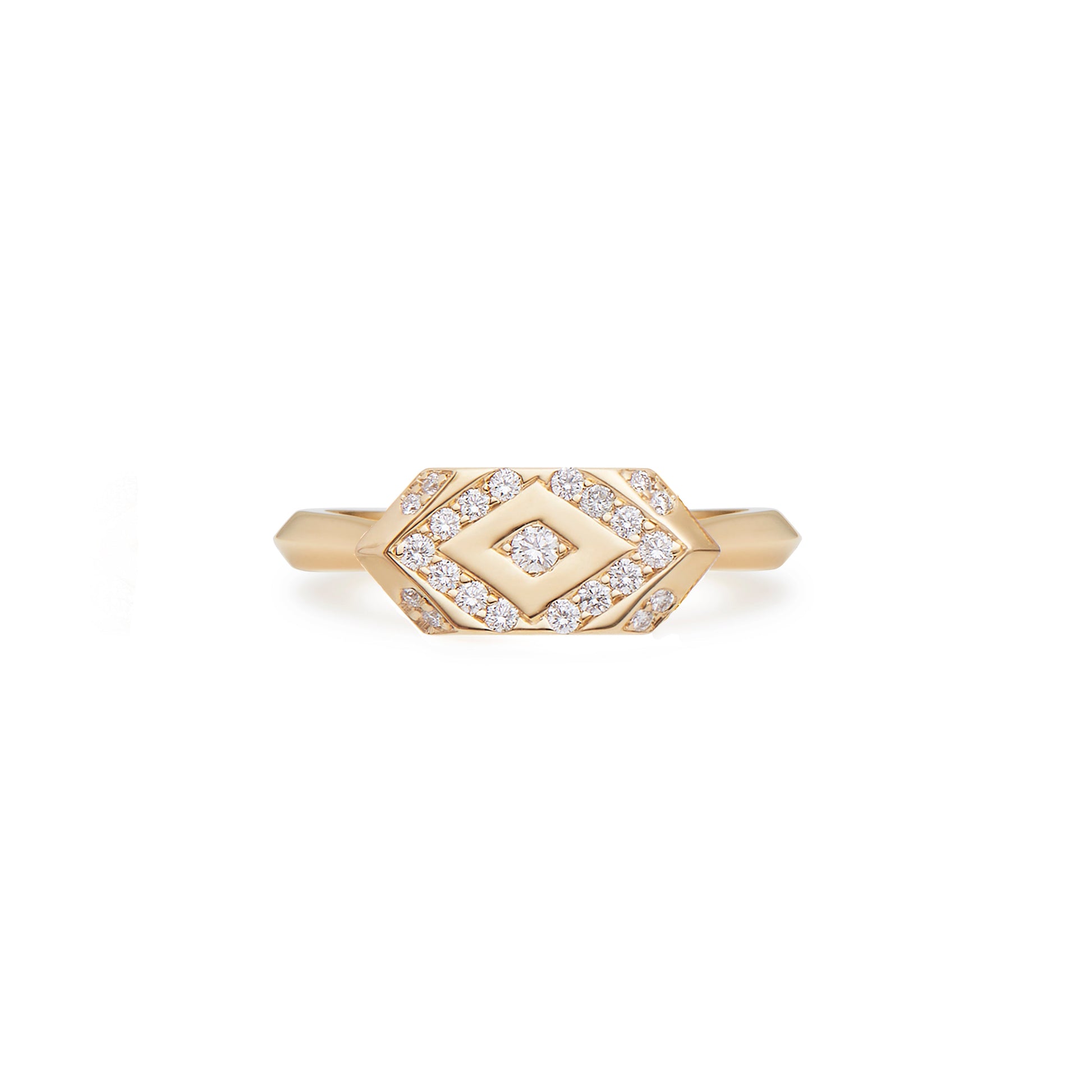 In literary symbolism, an arch signifies a rite of passage; a crossing. With a delicate shape designed to invoke this meaning, the Archway Collection ring is a symbol of new beginnings, new perspectives and renewal. Created in 18K yellow gold and polished to a mirror finish, the design features a delicate maze of diamond pavé. All diamonds are responsibly sourced and are D-E in color and VS2 or higher in clarity. The archway motif is 12mm in length and 6mm wide.