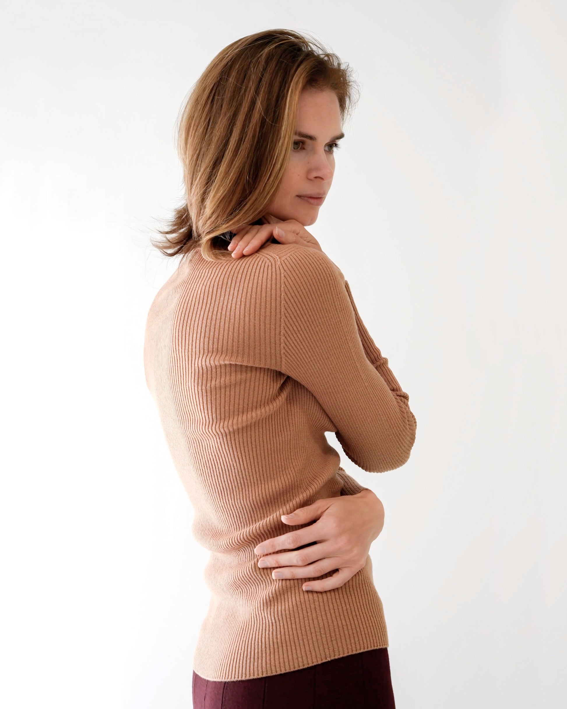 Designed with both comfort and sophistication in mind, the Astrid stretches effortlessly, adapting to your shape while maintaining an elegant fit. Its lower hem is suitable for those with a longer torso or simply gives a high-end 90s thermal look (if you know you know). Merino wool's natural temperature-regulating and moisture-wicking properties keep you cozy without overheating, and its odor-resistant qualities mean fewer washes, more wear. Whether styled solo or layered, the Astrid offers versatile elegance that transitions from casual outings to more formal occasions.