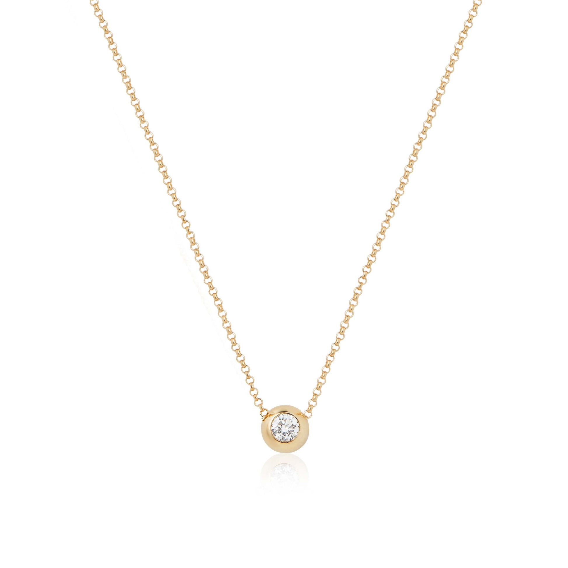 The timeless simplicity of a single round-brilliant diamond pendant, but set with a twist. This jewel features a solid 18K yellow gold bubble, polished to a mirror finish, that frames a 0.10 carat diamond.