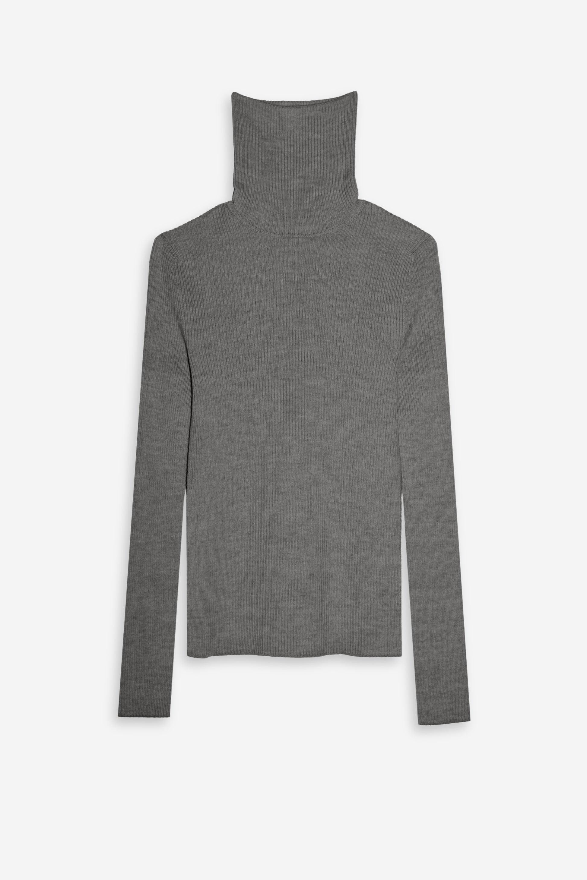 Long-sleeve ribbed turtleneck sweater in midweight Italian merino wool with a close fit, natural stretch and seamless construction.