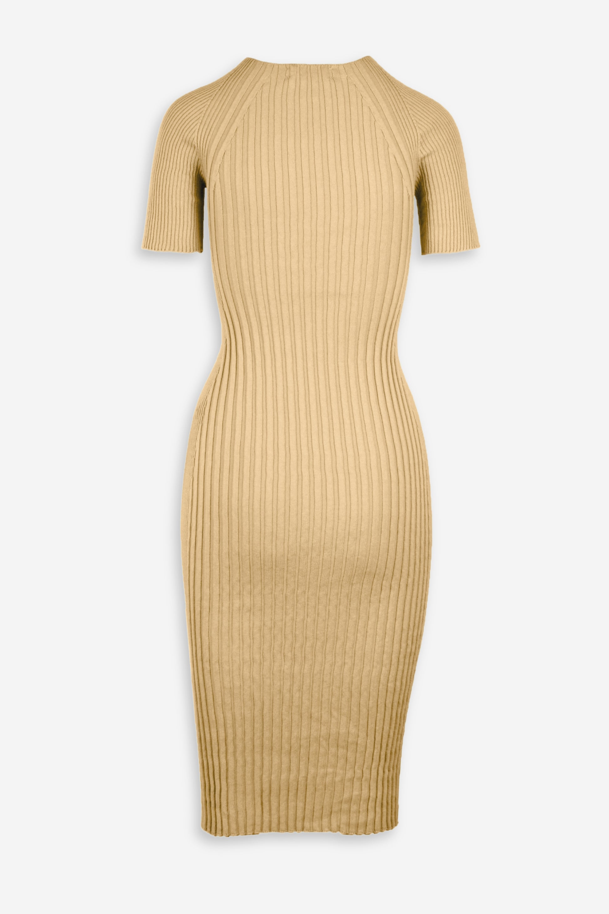 A lightweight knit dress with vertical texture and subtle structure. Knit from 100% organic Egyptian cotton, this mid-length dress features a high neckline, short sleeves, and a seamless, articulated rib fit—offering a considered, refined option for versatile, elevated styling.