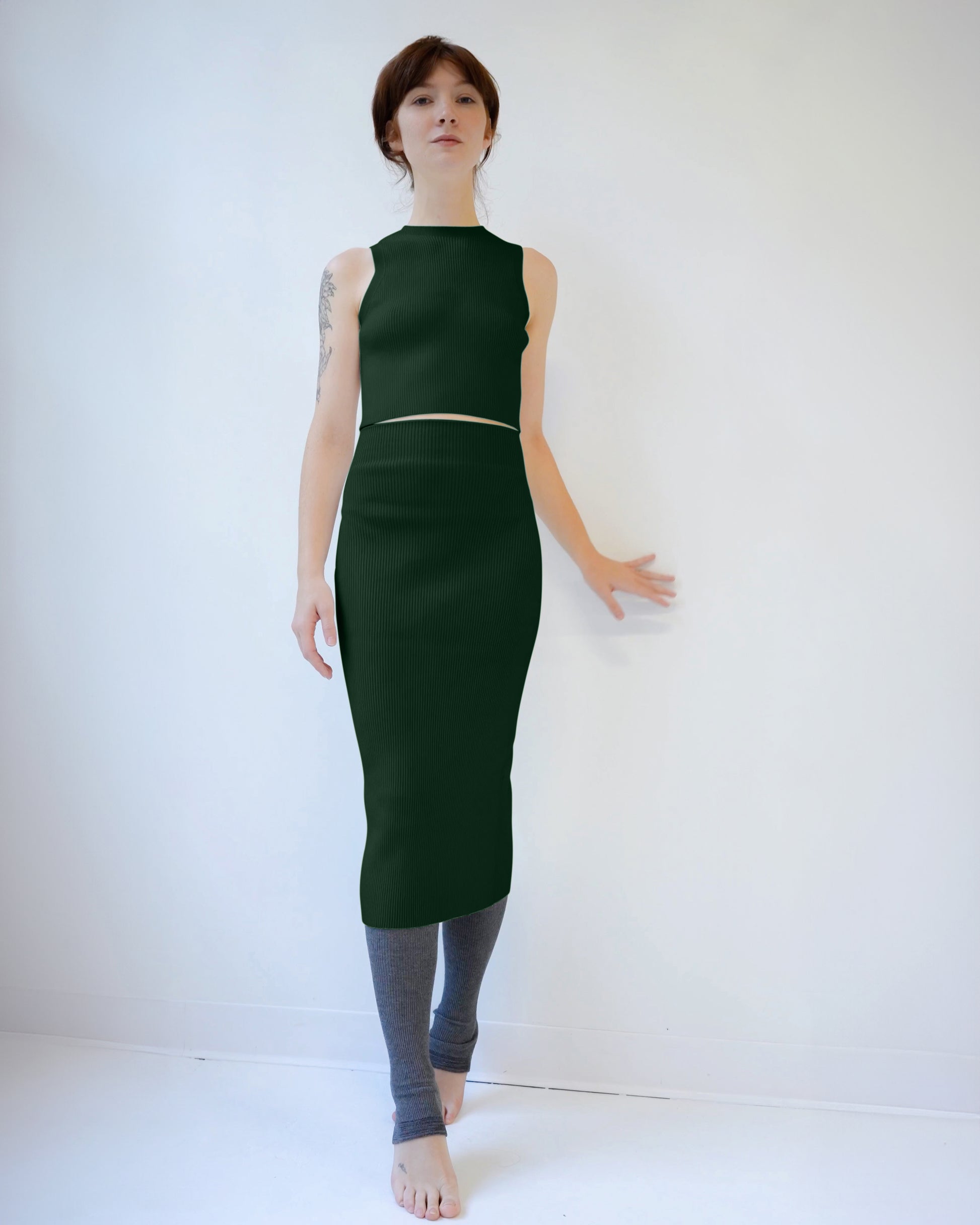The Simone Top is made in our eco-viscose yarn, an easy-care stretch viscose that has a smooth finish and performance properties. Simone is wonderfully versatile and beats the seasonality of the average tank. The 2x2 rib knit creates a very forgiving stretch. Wear Simone solo on warm days and transition to fall by layering it over shirts as a cropped sweater-vest. Pair your Simone Top with the Serena Skirt for a coordinated set that accentuates the waist and creates a flattering hourglass shape. The styling possibilities are endless